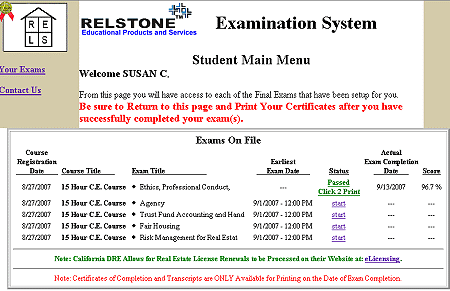 - at the completion of the last chapter, student given link to RELSExSys (Exam2007) to take Final Exam